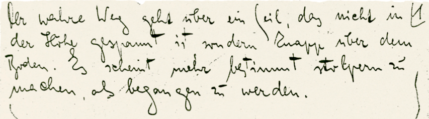 De zin komt uit de pen van niemand minder dan de uit Praag afkomstige schrijver Franz Kafka (1883-1924), een van de belangrijkste auteurs van de twintigste eeuw. Het woord kafkaësk of kafkaiaans is afgeleid van de ervaringen van de personages in zijn oeuvre. Wat hun overkomt is op raadselachtige wijze beangstigend, bedreigend en onontkoombaar. Zijn meest indrukwekkende novelle is voor mij zijn In de Strafkolonie. Hierin beschrijft Kafka een apparaat waarmee de tekst van elk oordeel op de rug van de veroordeelden ingegraveerd wordt.