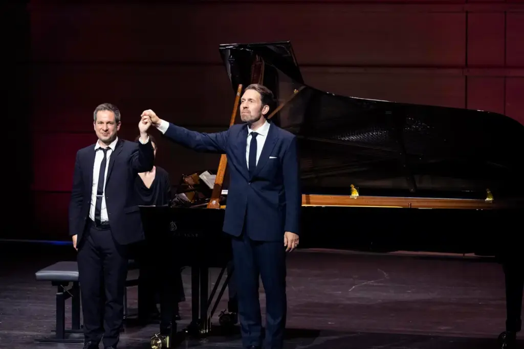 De Hommage à Farkas Ferenc (Kurtágs leerar compositie) begon met impressionistische piano watervallen. Andsnes’ zilverig parelende loopjes waren veel te snel voorbij. In het daaropvolgende Les Adieux (in Janáceks Manier) toonde Andsnes op indrukwekkende wijze zijn muzikale vertelkunst. En zo was elk stuk een miniroman met overdonderende pianoclusters of met een door virtuoos pedaalgebruik opgeroepen onwerkelijke echo. Net als in de tweede helft (maar dan met omgekeerde rollen) kwam Chamayou nu vóór de pauze terug voor 3 Kurtág miniaturen quatre mains en een afsluitende Schubert.